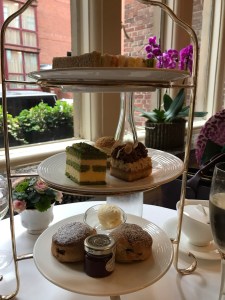 Next came two very fresh fruit scones accompanied by those essentials of the Afternoon Tea ritual – clotted cream and strawberry jam. I felt in need of a rest before I tackled the final course, the cakes, and I seemed completely at liberty to take a pause before I continued. There was no feeling of being rushed by the staff who returned to my table intermittently to replenish my tea.