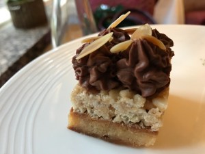 And to finish, a chocolate and peanut flavoured pastry with a moist base, a crunchy centre and a ganache topping. Delicious!