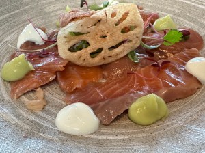 Eventually my first course was delivered and it looked fresh, light and delicate. As appealing as it looked, I rather regretted declining a heartier dish to begin the meal. I hadn’t eaten for many hours and felt the need of something rather more substantial. I realised this could be easily remedied and – that word again – eventually captured the attention of the waiter to request a basket of bread. With a glass of Prosecco streaming it’s bubbles to the surface and the cured salmon glistening, I gave up any idea of eating the bread with the first course and got started on the chilled food.