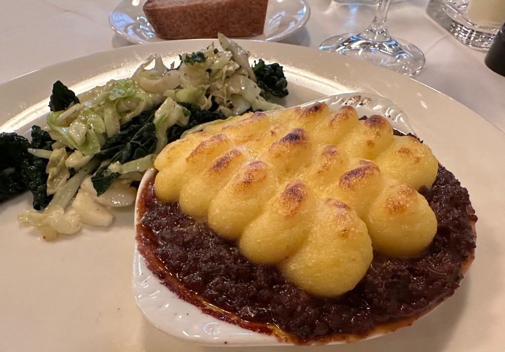 I almost always ask for wine recommendations to match dishes in restaurants and the suggestion of a glass of Malbec to go with the Cottage Pie was very good. This French wine, from Cahors in South-Western France, was delicious. Very deep red – almost purple – the initial flavours of cherry and blackberry provided freshness. Then complex layers of “forest floor” earthiness, liquorice and spice developed. It was a wine to be sipped and savoured.